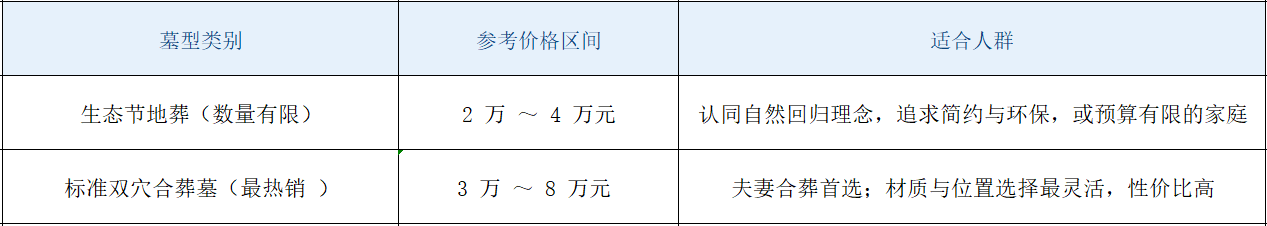 实用建议:预算在 5 万以下的家庭,优先考虑园区外围平地区域,风格简洁,性价比突出;预算高点以上,可重点看山坡墓区,采光与视野明显更优。